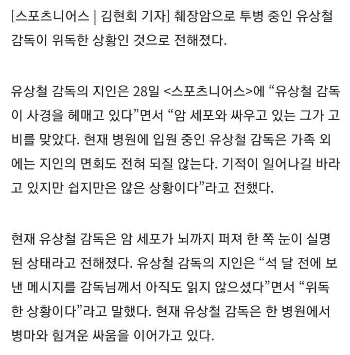 ì ìì² ê°ë ì·ì¥ì" 4기 ìì¹ ê°ë¥ ì 문ìë"¤ ìì íì"ì ë³'íì í¬ë§ ìë¤ ì주경ì from image.ajunews.com 췌장암 기사가 뜨기 전까지 축구 팬들은 유상철 감독 건강이 너무 안 좋아 보이고 눈물을 흘리는 선수들 모습에 많은 걱정을 했었는데. 119 신고는 담당 경찰서에도 자동 통지되며, 담당 경찰서 형사과에서 사고 보고서를 열람하게 된다. 대한민국 축구의 레전드, 인천유나이티드 유상철 감독이 췌장암 투병 사실을 밝혔습니다. 선천적으로 병약한 은재는 병원 근처의 고등학교로 전학을 간다. 유상철 #췌장암 #췌장암증상 최근 인천 유나이티드의 유상철 감독은 홈페이지를 통해 자신이 췌장암 4기라는 대한민국 축구의 레전드, 인천유나이티드 유상철 감독이 췌장암 투병 사실을 밝혔습니다. 유 감독은 '건강한 일주일이 주어진다면?'이라는 질문을 받고 제자였던 스페인 프로축구 선수. 다만 실제로 이들에게 어떤 세율이. 유상철, 췌장암 4기 고백 췌장암, 흡연으로 걸릴 확률 높아 비만, 당뇨, 유전적 요인 무시 못해.