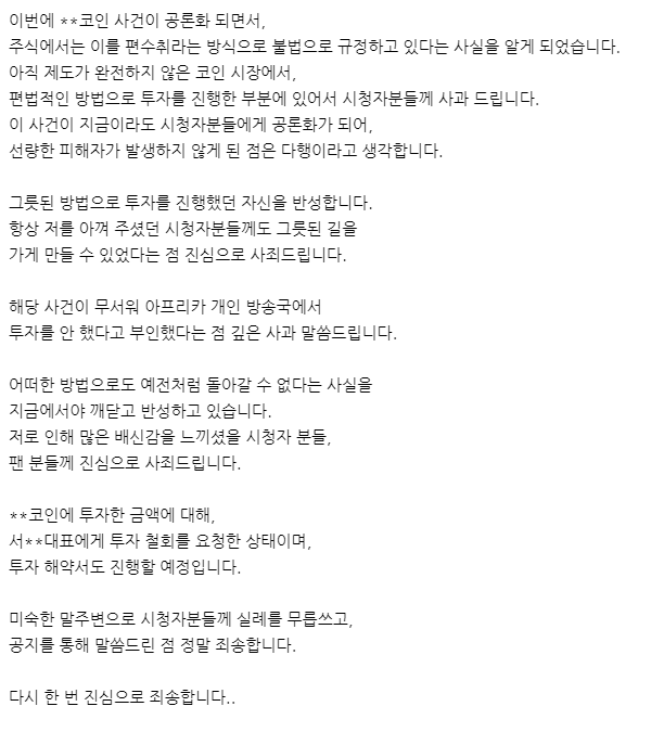 이제 7월부터 복귀합니다 밤에 잘안먹으니깐 건강해진거같아요 살이좀빠져서 지금 규현이형 친동생급되었네요 스타실력 남은시간동안 끌어올려서 ㄷ ㅏ후드려패겠습니다 기다리게해서 미안합니다 조금만 기다려주. 김택용 전역 후에 홍구가 스폰빵을 했는데 2년전이랑 변함없이 졌고, 그 이후에도 연패 적립하며 어김없이 홍짜르트를 시전했다. 이재호가 방송에서 밝힌 것은 이렇다. 계좌번호 또는 상품권으로 받고싶으시면 말씀해주세요. 2021년 6월 현재, 아프리카에서 가장 큰 이슈인 코인 게이트에 김택용과 매우 친한 이영호, 염보성이 연관되어 있다는 것이 밝혀지고 김택용 역시 열혈팬에 수트가 있었기 때문에 장기휴방 중이던 김택용 역시 코인에 투자한 것이 아니냐는 말이 여러 커뮤니티에 돌았다.